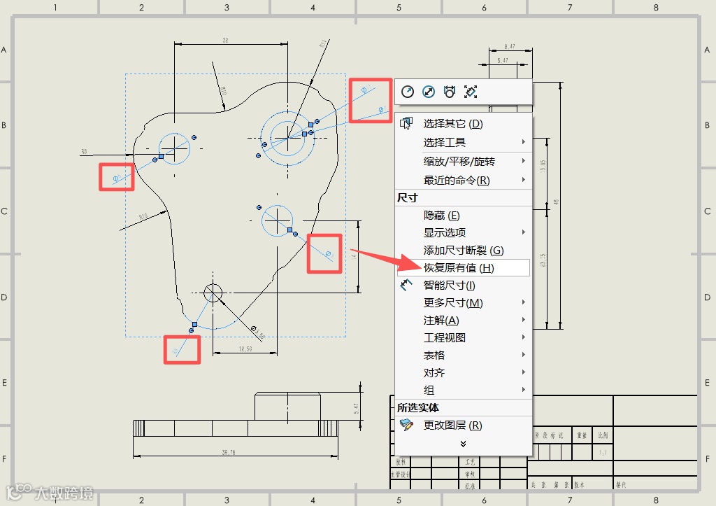 4. 快速恢复原值:找到高亮显示的覆盖尺寸后,无需进入属性管理器。选择(可以多选)尺寸并右键单击,在弹出菜单中选择“恢复原有值”,即可一键将其恢复为模型驱动的原始数值,极大减少了鼠标操作轨迹。