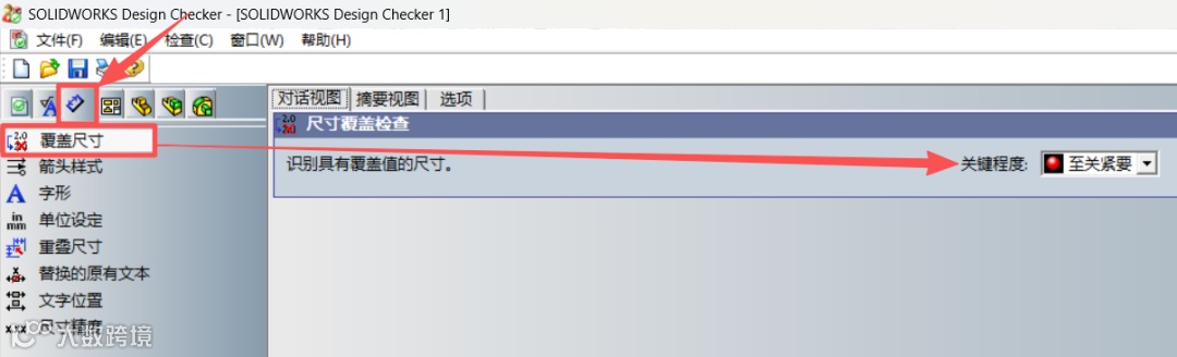 3. 设定关键检查规则:在检查列表中,找到“尺寸检查”下的“覆盖尺寸”选项。将其关键程度设置为“高”或“至关紧要”。