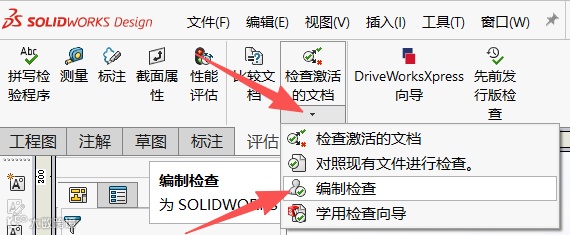 1. 创建检查标准:点击【评估】下拉列表,选择【检查激活的文档】->【编制检查】。