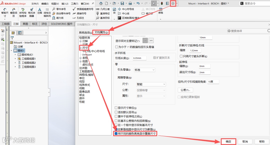 2. 启用高亮显示:依次点击【选项】->【文档属性】->【尺寸】,勾选“用不同的颜色高亮显示覆盖尺寸”。启用后,工程图中所有被覆盖的尺寸将立即以突出颜色显示。