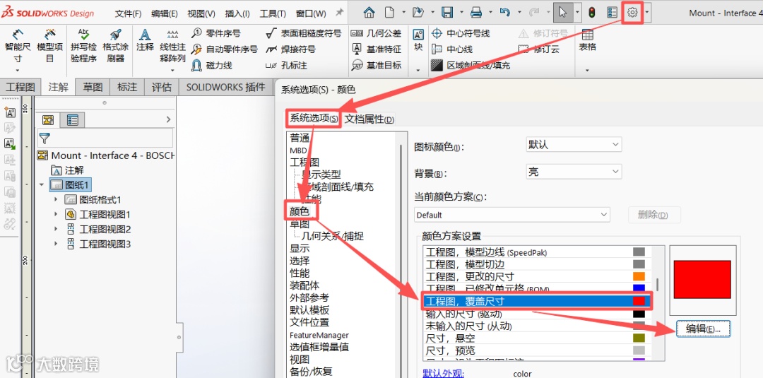 1. 自定义高亮颜色:前往【选项】->【系统选项】->【颜色】->【工程图,覆盖尺寸】,为您喜欢的警示颜色(如亮红色或橙色)。