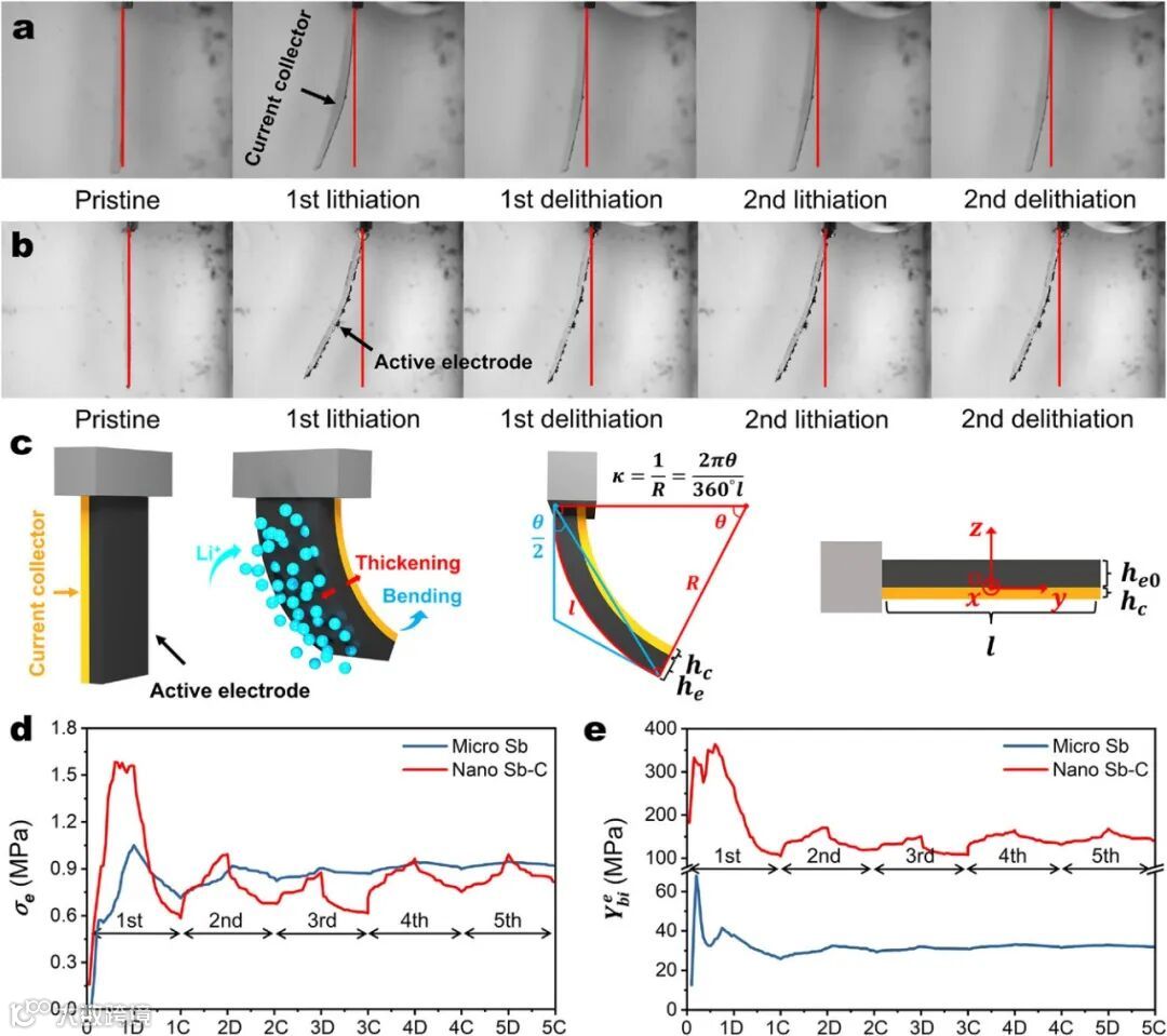 图5a-b的光学图像直观显示电极在充放电过程中的可逆弯曲行为。图5d的计算发现:Nano Sb-C首次锂化后产生更高的压应力(1.58 MPa)——这恰恰说明其结构坚固,没有通过破碎来“泄压”;后续循环中,应力在0.99-0.61 MPa之间可逆变化。
