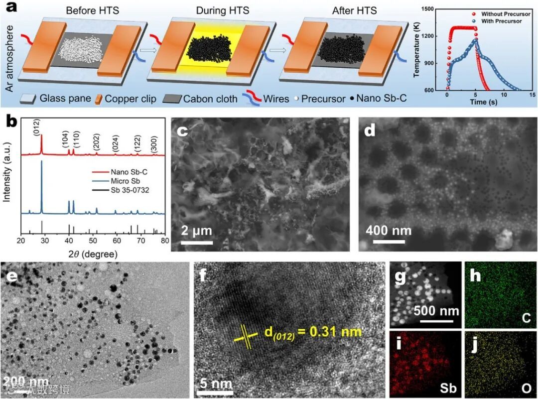 图1c-d的SEM,20-50 nm的Sb纳米颗粒均匀、牢固地“镶嵌”在碳基体上,和微米Sb的2-5 μm不规则颗粒形成鲜明对比。图1e的TEM显示,碳基体中存在大量缺陷和孔隙——这正是HTS瞬时高温过程中抑制Sb团聚、控制尺寸的关键“限域单元”。图1f的HRTEM看到清晰的Sb(012)晶格条纹,图1g-j的EDS面扫证实C、O、Sb元素分布高度吻合。