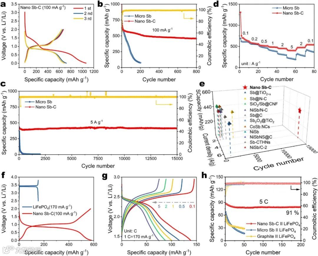 结果:5 A/g超高电流密度下循环15,000次,容量仍保留415.7 mAh/g——这是迄今所有Sb基负极的最佳纪录。全电池5C倍率下200圈容量保持率91%。