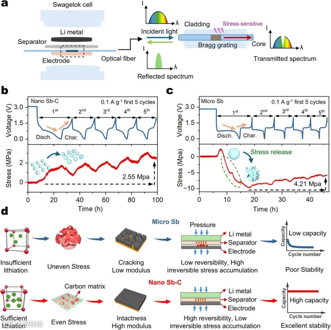 图6b-c显示:Nano Sb-C电池的应力呈高度可逆的周期性变化,5圈后不可逆应力积累仅0.88 MPa——机械响应极其稳定。微米Sb电池的应力信号首次锂化后就变得杂乱无章,积累了4.21 MPa的不可逆应力,是内部结构持续破坏、SEI过度生长的直接证据。