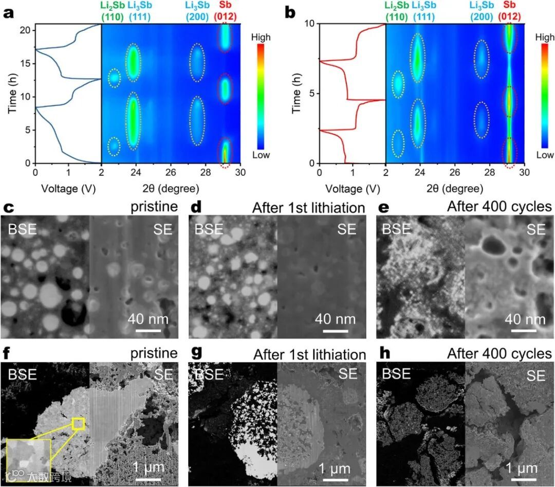 图3a-b的原位XRD:Nano Sb-C在锂化过程中,Sb衍射峰完全消失,所有Sb都转化成了Li₃Sb,脱锂后Sb峰完美重现——相变完全可逆;微米Sb的Sb峰始终残留,反应不完全,大量Sb“置身事外”。