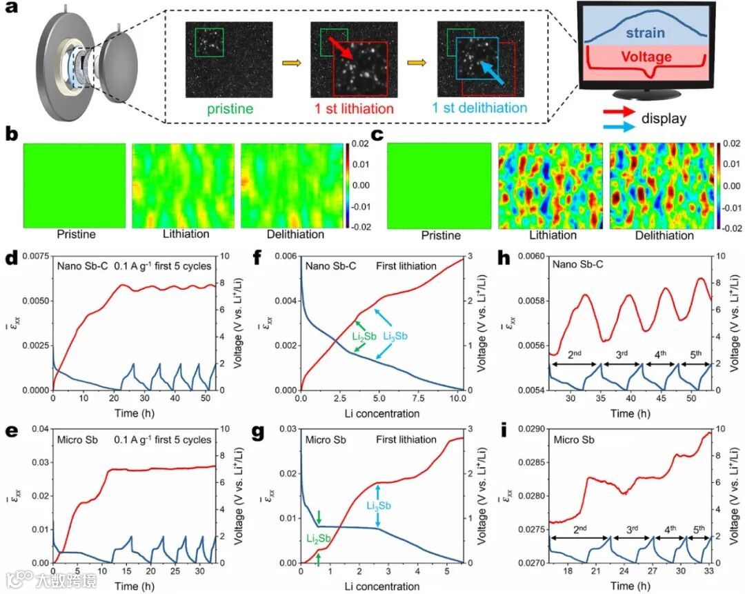 图4d-e的应变随时间的演化曲线:Nano Sb-C的应变随锂化/脱锂呈近乎线性的可逆变化;微米Sb在首次锂化后应变就“定格”在高位,几乎不恢复。