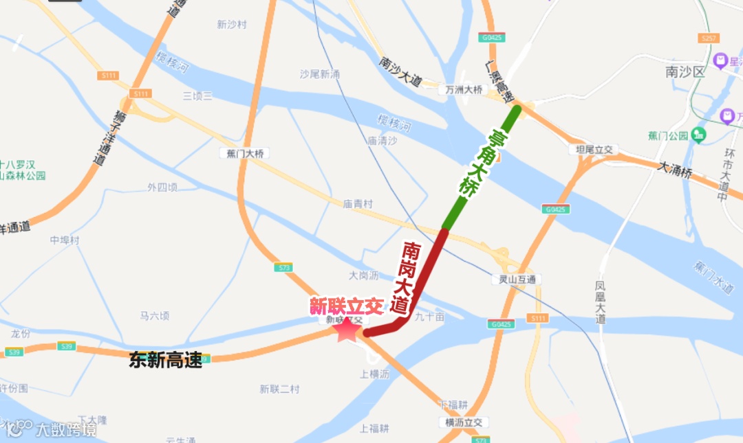 其中,为了让南沙中心城区能快速连接东新高速,从亭角可以直上东新高速,实现南沙⇋广州中心城区40分钟的目标,南沙规划新建了南岗大道。