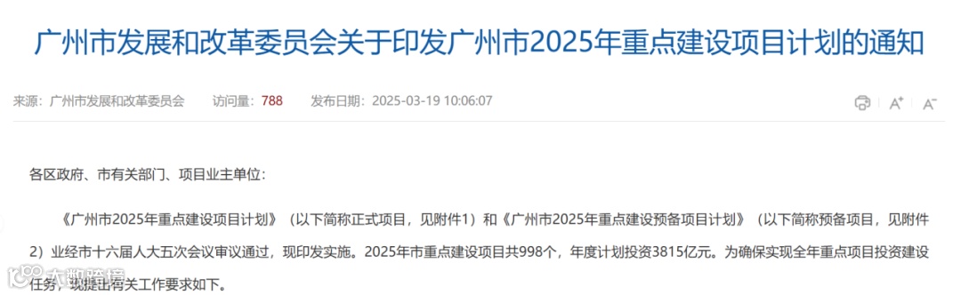 近日,广州市2025年重点建设项目计划正式公布。今年,广州安排市重点建设项目共998个,年度计划投资3815亿元。其中,正式项目共905个,年度计划投资3657亿元;预备项目共93个,年度投资计划158亿元;涉及南沙的重点建设项目(含在地项目)超100个,含基础设施、产业建设、生态环保、社会民生、城市更新等多个领域。