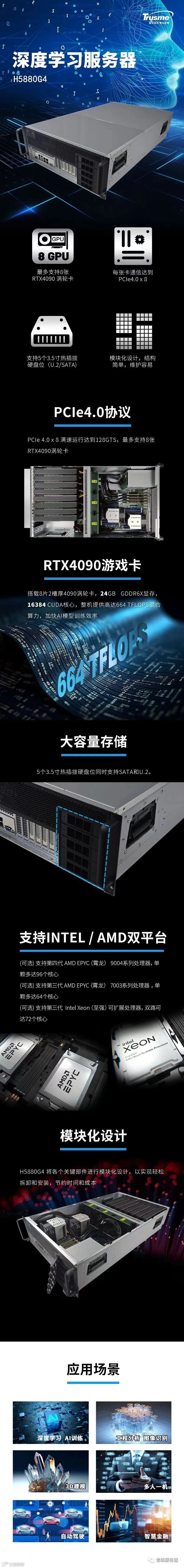 作为信维完全自主研发的AI服务器,信维H5880G4在CPU和GPU的规格上做了合理调整,具备卓越性能、算存一体、性价比高等优势,可应用于深度学习模型训练、深度学习推理等AI应用场景,灵活匹配训推算力需求。H5880G4采用第三代英特尔® 至强® 可扩展处理器系列或可选第四代AMD EPYC处理器,4U空间支持8张NVIDIA RTX4090(涡轮版)做并行计算,24GB GDDR6X显存,16384 CUDA核心;前后空间充足,无结构干涉,显卡采用尾部供电设计,也不需要额外选购凸起顶盖。支持PCIe 4.0,通过 PCIe 扩展最多可支持8张4090 GPU卡,整机提供高达664 TFLOPS混合算力,加快AI模型训练效率,助力智能时代。