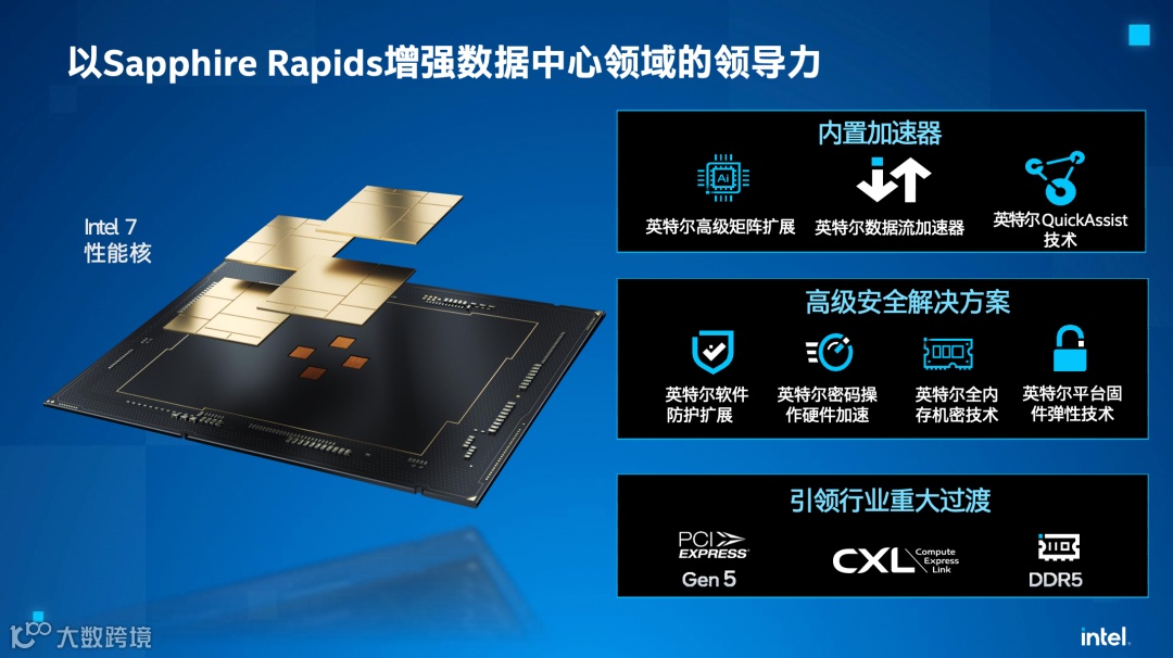 ● Sapphire Rapids:对于采用Intel 7制程工艺制造的性能核系列,英特尔主要围绕Sapphire Rapids展开了分享。Sapphire Rapids是迄今为止英特尔功能最丰富的至强处理器,增强了其在人工智能、安全性等几大关键数据中心领域的领导地位。3月,英特尔将开始逐步出货Sapphire Rapids处理器,并通过DDR5、PCIe 5.0和全新Compute Express Link高速互连的标准技术引领整个行业向下一代内存和接口标准过渡。