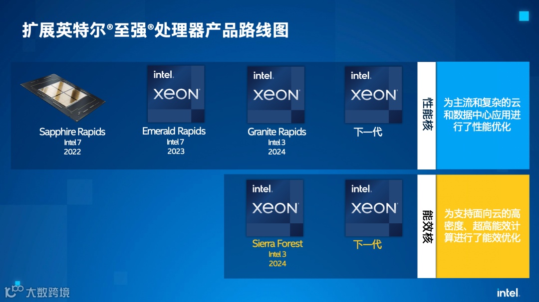 面向未来几代至强处理器,英特尔制定了全新的架构策略——即同时拥有基于性能核(P-core)和能效核(E-core)的双轨产品路线图,以将两个优化的平台整合为一个通用、定义行业发展的平台。该全新架构策略将更大限度地增强产品的每瓦性能和细分功能,从而全面增强英特尔在业界的整体竞争力。在采取新策略的同时,英特尔也进一步增强了与现有广泛的至强平台生态系统的兼容性,以为用户带来更好的投资收益。