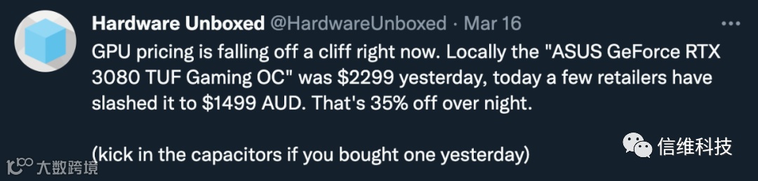 据澳大利亚 YouTube 频道 HardwareUnboxed 报道,华硕 RTX 3080 TUF 仅一天就降价了 35%,价格从 2299 澳元(1685 美元)降至 1499 澳元(1100 美元)。虽然仍比建议零售价贵得多,但对于澳大利亚市场而言,新价格应该对潜在买家更具说服力。