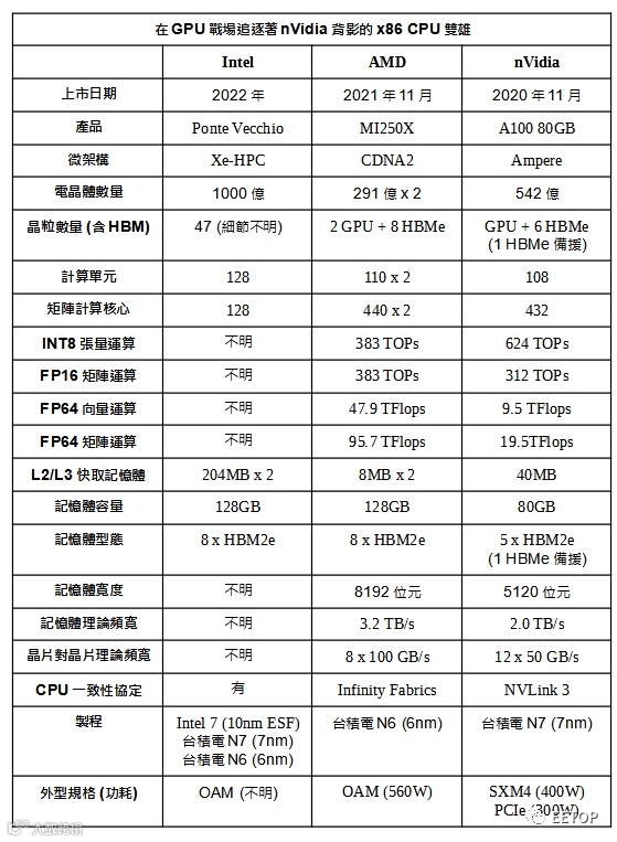 以下表格同场加映英特尔Xe-HPC,让大家瞧瞧这三家厂商的旗舰GPU加速卡究竟有何不同。