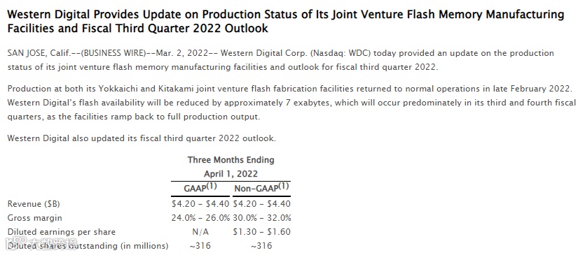 直到3月2日,西数在其官网发布公告称,此前受影响的两家工厂已于2月底恢复运营,西数的闪存可用性将减少约7EB,这将主要发生在其第三和第四财季,因为设施恢复正常到满负荷生产需要时间。