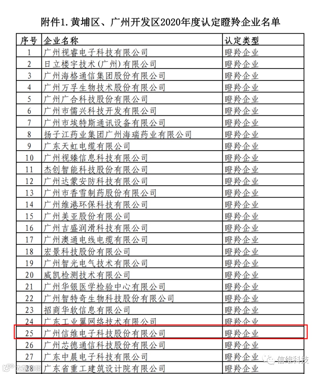近日,广州开发区2020年度瞪羚企业认定名单正式公布,广州信维电子科技股份有限公司被评选为2020年度瞪羚企业。这是信维第三次蝉联“瞪羚企业”荣誉称号,也是对信维创新能力、技术实力和成长速度的高度肯定。