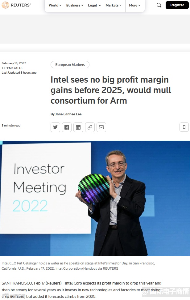 国际电子商情了解到,早在今年2月,英特尔CEO就曾表示,如果有财团有意对Arm发起收购,该公司有意参与其中。