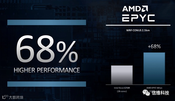至于三代EPYC的性能,AMD官方没有公布太多数据,只用了32核的EPYC对比了28核的至强6258R处理器,现场演示了第三代AMD EPYC处理器“米兰”运行天气研究和预报模型(WRF),该模型是用于气候研究和天气预报的最受欢迎的工具之一。