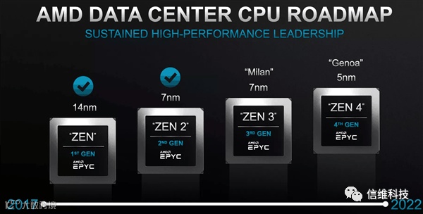 AMD在2017、2019年分别推出了第一代EPYC(代号Naples)、第二代EPYC(代号Rome),核心数最多分别是14nm 32核Zen、7nm 64核Zen2, 第三代EPYC则会升级到7nm Zen3,依然最多64核128线程,128条PCIe 4.0,8通道DDR4内存。