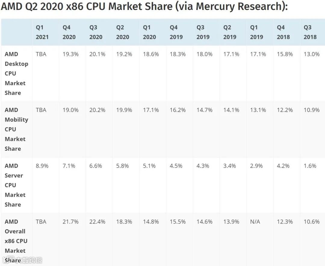 显示,在 2020 年四季度全部 x86 CPU 的市场中,AMD 的桌面产品占比 19.3%,移动平台占比 19.0%,总体市场占有率在 2020 年末为 21.7%。