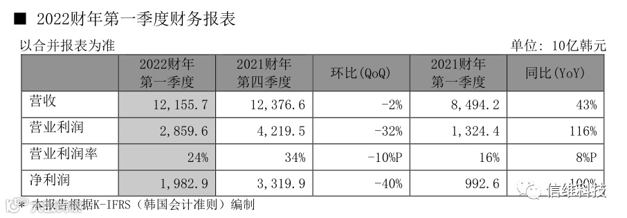 SK海力士发布截至2022年3月31日的2022财年第一季度财务报告:第一季度结合并收入为12.156万亿韩元(约合96.4亿美元),同比增长43%,环比下滑2%;营业利润为2.860万亿韩元(约合22.7亿美元),同比大增116%,环比下滑32%;净利润为1.983万亿韩元(约合15.7亿美元),同比增长100%,环比下滑40%。2022财年第一季度营业利润率24%,净利润率16%。