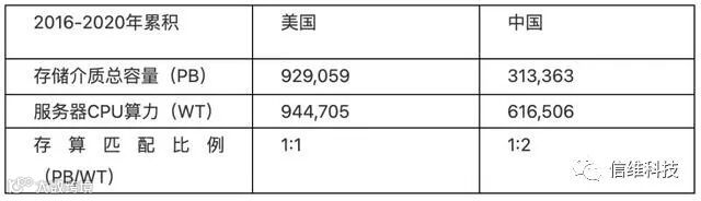 在存储、计算的匹配比例(算力:容量)为1:1,相比而言,中国在存储、计算的比例仅为1:2,比例严重地失衡,说明我们的数据资源还不够丰富。