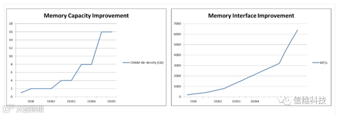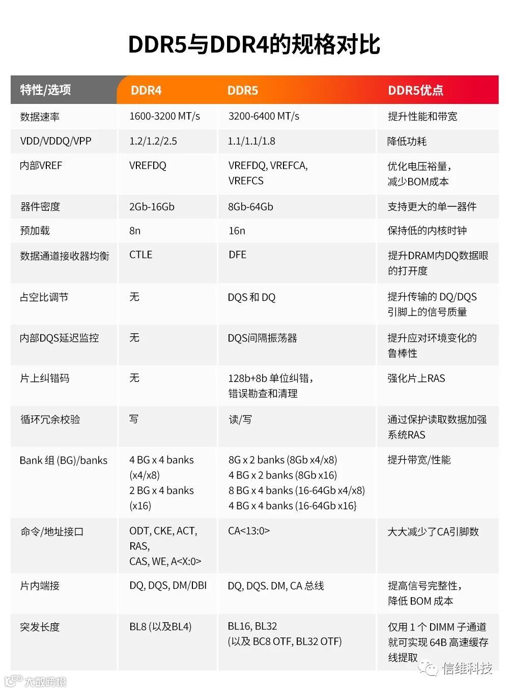 DDR内存可以在一个时钟周期内两次发送和接收数据信号,这一速率是20世纪70年代、80年代和90年代生产的DRAM的两倍。DDR4是2014年下半年发布的第四代DDR SDRAM,而DDR5虽然是第五代,但与DDR2、3和4的升级迭代相比有了很大的变化。前几代产品的迭代重点主要集中在如何降低功耗上,移动和终端应用是其主要推动力;而DDR5的主要推动因素,则是因为新型处理器内核数量越来越多,导致现有的内存带宽跟不上节奏,必须进一步提高带宽的需求。