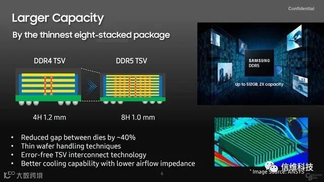 在2021年的HotChips 33大会上,三星公布了旗下首款也是业内首款的单条512GB DDR5内存条,频率为7200MHz。根据三星公司发布的信息,此次展示的512GB单条DDR5内存条产品采用了三星旗下的8H堆叠TSV技术,通过八层从的堆叠实现更小的体积作用。相比较于此前三星推出的4H TSV技术的DDR4内存条,其能减少接近40%的芯片间间隙。