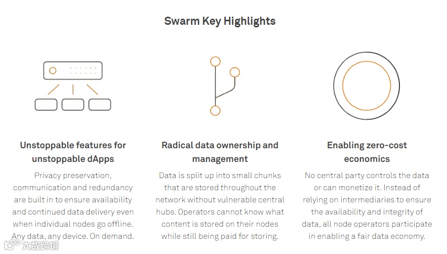 用户拥有数据所有权和管理权:Swarm网络会把数据分成小块,并分散存储在整个网络中,Swarm是一个分散的网络,节点运营商无法知道节点上存储了哪些内容,同时仍需支付存储费用,即用户拥有数据所有权和管理权。
