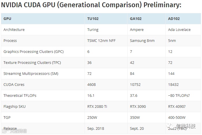 规格方面,据说旗舰款 AD102 GPU 拥有多达 144 组 SM 单元 / 9216 核。若按照英伟达的新计数方式,则是 18432 个 CUDA 核心。