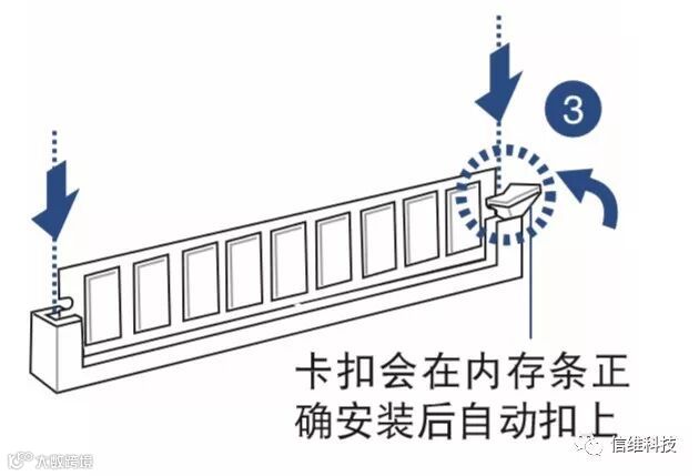 3、最后缓缓将内存条插入插槽中,若无错误,插槽两端的白色卡扣会因内存条的安装而自动扣到内存条的两侧的凹孔中,确保内存条不松动(请始终以垂直方向插入内存条,防止内存条缺口损坏);