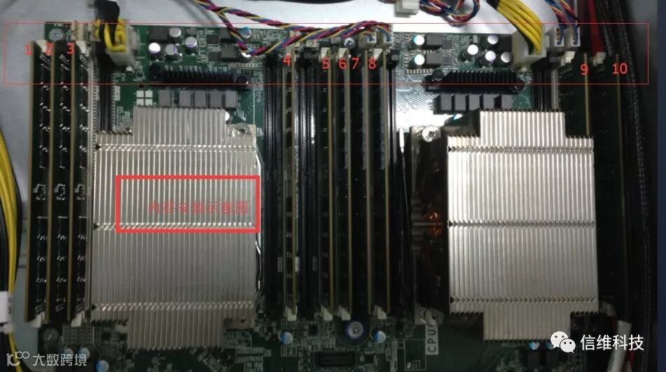 2、内存安装插槽位置:安装10条内存,将10条内存分别安装在CPU0插槽两侧的A0,A1,B0,C0,D0内存槽,CPU1插槽两侧的A0,A1,B0,C0,D0内存槽(参照下方示意图数字1-10位置);