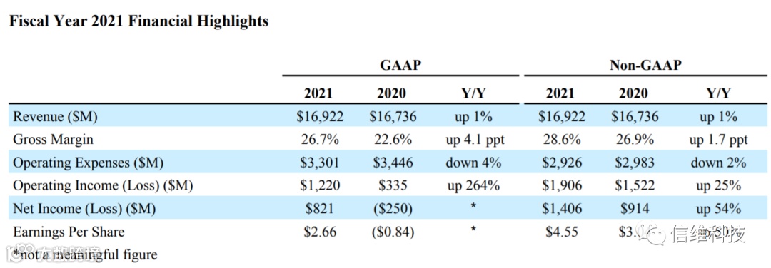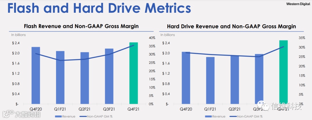 就2021财年全年来看,西部数据营收达169.22亿美元,同比增长1%,GAAP准则下,毛利率为26.7%,营业利润12.2亿美元,同比增长264%;净利润8.21亿美元,相较上一财年实现扭亏为盈,每股摊薄收益2.66美元。