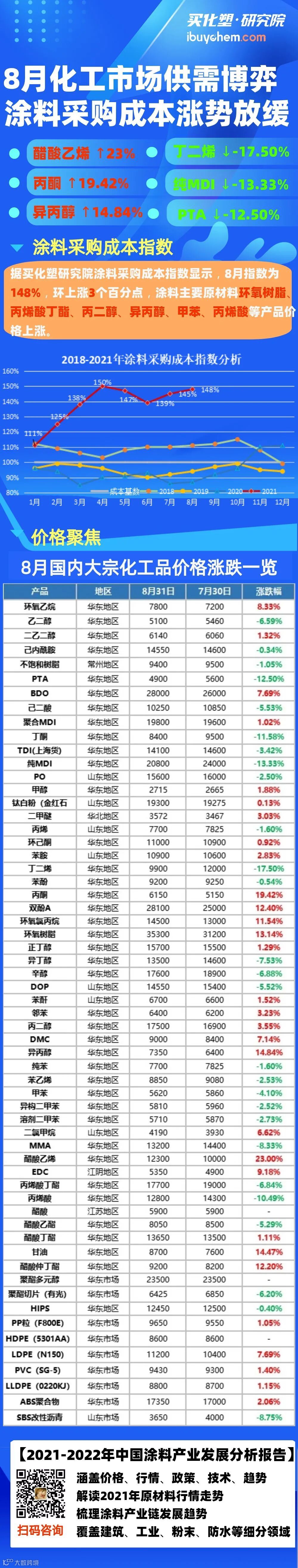 据买化塑研究院统计数据显示,8月上涨品种30个,下跌产品27个,持稳3个,涨幅前三产品为醋酸乙烯↑23.00%、丙酮↑19.42%、异丙醇↑14.84%;跌幅前三的产品分别为丁二烯↓-17.50%、纯MDI↓-13.33%、PTA↓-12.50%。