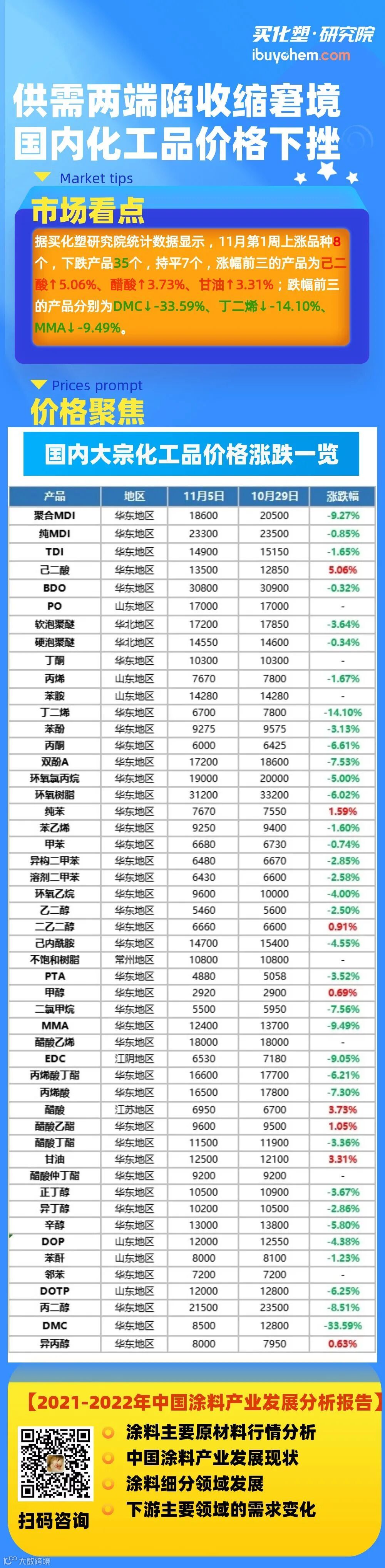 据买化塑研究院统计数据显示,11月第1周上涨品种8个,下跌产品35个,持平7个,涨幅前三的产品为己二酸↑5.06%、醋酸↑3.73%、甘油↑3.31%;跌幅前三的产品分别为DMC↓-33.59%、丁二烯↓-14.10%、MMA↓-9.49%。