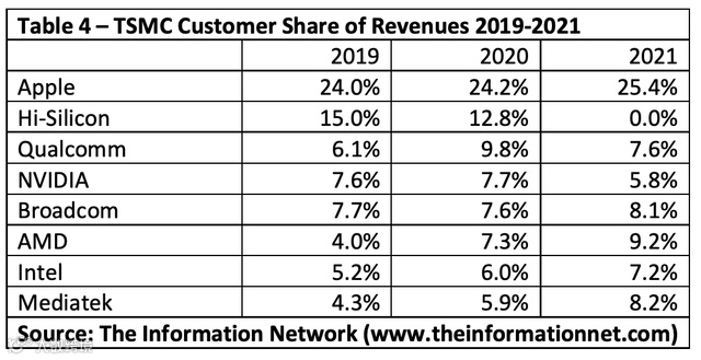 联发科今年份额大有上升,如果它在华为失利后增加自身的出货量,会有更大的作为。英特尔是另一个值得关注的份额上升的客户,2021年从台积电获得的收入比两年前会多出一大截。