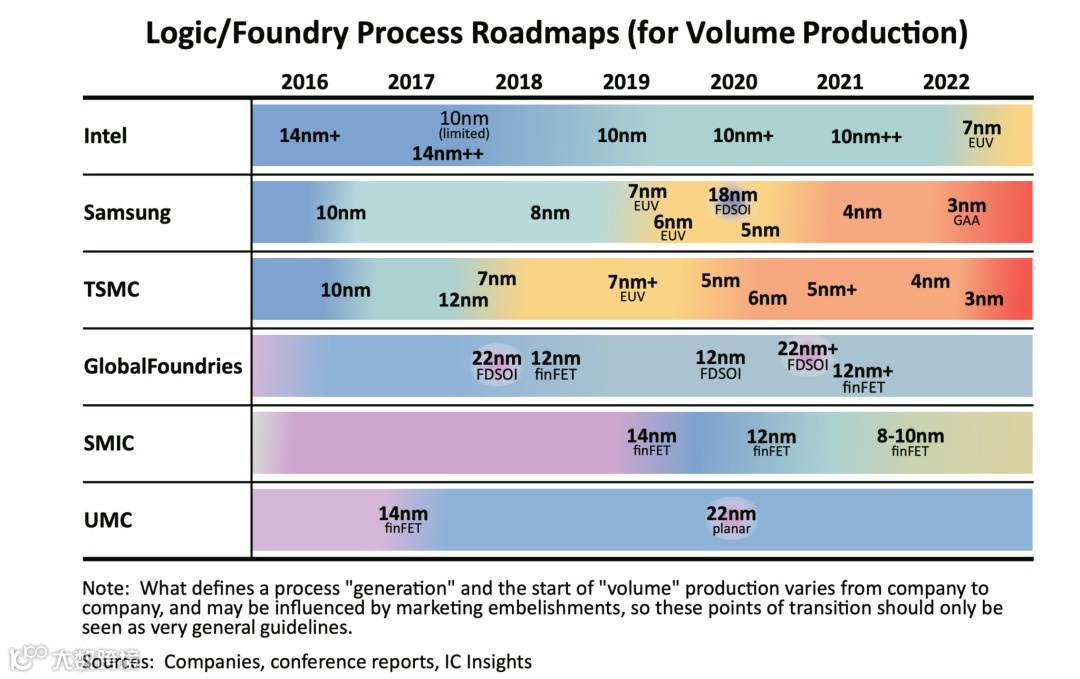 IC Insight的工艺节点路线图。注意事项:正如IC特别指出,名称相似的节点不一定代表底层技术也相似,对于晶体管而言,它们的尺寸可能不一样。