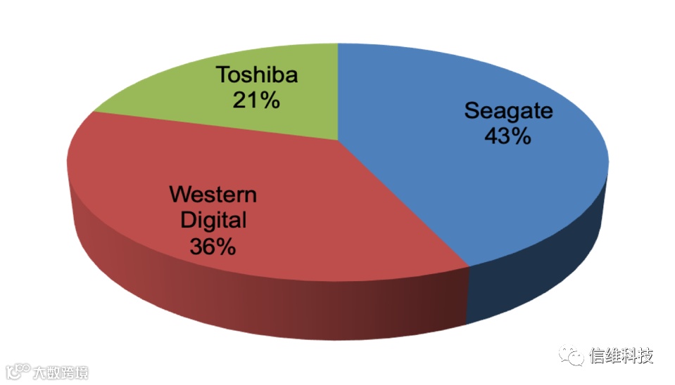 目前,在HDD市场中,主要玩家为希捷、西部数据和东芝,根据中国闪存市场ChinaFlashMarket数据,希捷以43%市场份额排名第一;西部数据以36%的市场份额排名第二;东芝则以21%的市场份额排名第三。
