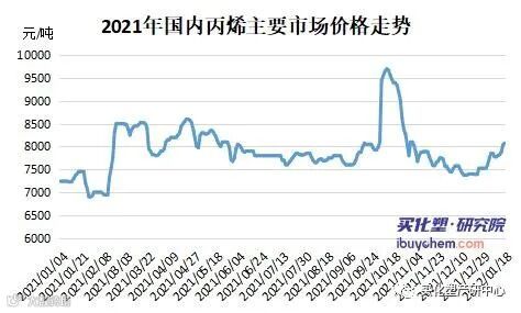 2021年,国内丙烯市场价格重心偏强回升,年度市场价格变化主要受成本、供需及其他影响因素共同作用导致,其中成本及需求是影响全年价格变化的主要驱动因素。以山东市场为例,2021年丙烯山东市场全年低价6900元/吨,高价9700元/吨,年均价为7903元/吨,价格波动幅度为16.38%。