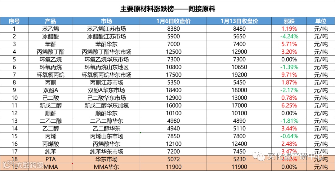 2、主要原材料涨跌榜-间接原料
