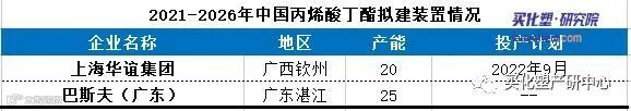 伴随上下游一体化装置投产释放,2022-2026年国内丙烯酸丁酯产能产量同步大幅增长,随着部分丙烯酸丁酯装置老龄化严重,将会出现频繁意外检修状况,2022年之后逐步过剩,行业竞争激烈,有可能出现降负荷运行状况,据不完全统计,未来五年丙烯酸丁酯拟在建产能45万吨,新增产主要集中在华南地区。预计2026年产能达到329万吨,产量254万吨。