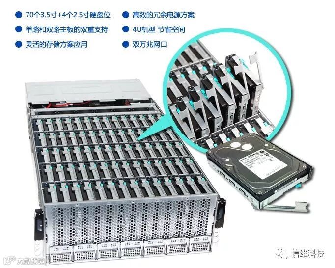 SW R422-G70I大存储服务器在4U空间中做到极致的高密度存储,最大支持到3PB的容量数据,标准4U机箱内排列的70个3.5寸+4个2.5寸硬盘位,每个主板均能控制所有的70个硬盘,任何时候单个节点的开关机状态不会影响整个系统,有效保证大码率图像的流畅读写,充分满足地铁海量数据存储要求。相比传统2U 12盘位机架式服务器,硬盘密度高达6倍,在同样硬盘数量情况下,SW R422-G70I可节省67%的机柜空间。