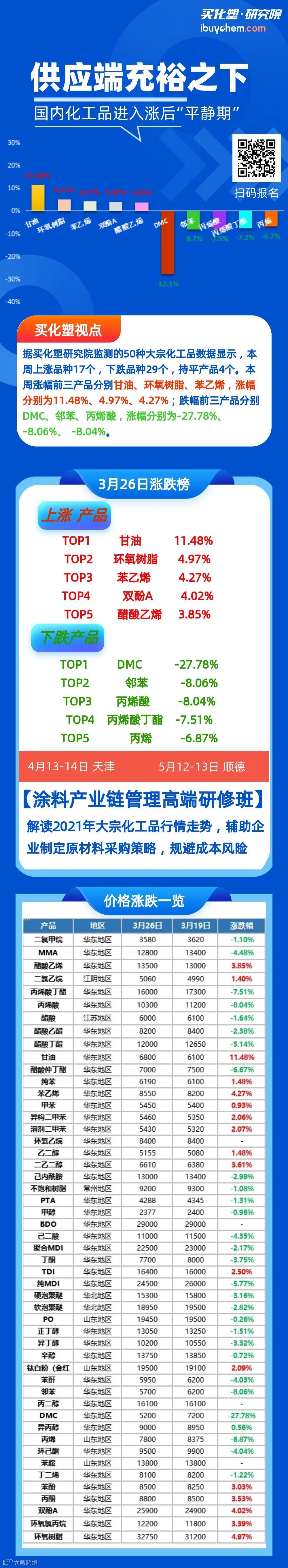 据买化塑研究院监测的50种大宗化工品数据显示,本周上涨品种17个,下跌品种29个,持平产品4个。本周涨幅前三产品分别甘油、环氧树脂、苯乙烯,涨幅分别为11.48%、4.97%、4.27%;跌幅前三产品分别DMC、邻苯、丙烯酸,涨幅分别为-27.78%、 -8.06%、 -8.04%。