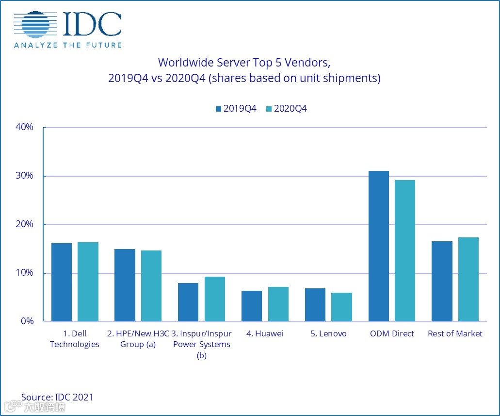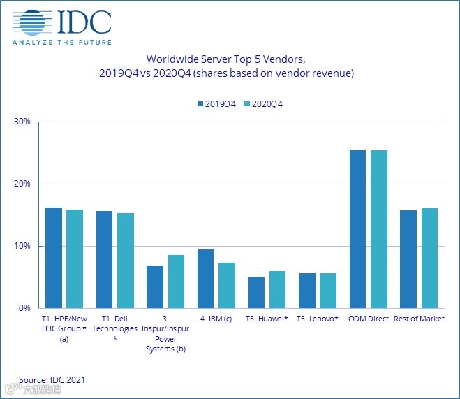 IDC统计显示:2020年第四季度全球服务器市场中HPE / 新华三和戴尔并列第一,浪潮/浪潮商用机器排名第三,IBM 排名第四,华为和联想并列第五。