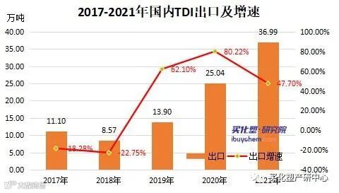 据海关数据显示2021年中国共出口36.99万吨TDI,较2020年增44%,月均达3万吨。