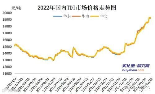 春节过后,国内TDI市场价格出现上行态势,截止至目前市场主流价格涨至19400-19600元/吨,上海货交投价在19700-19900元/吨。