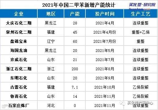 2021年国内二甲苯累计新增415万吨/年,其中涉及二甲苯外销的产能约在95.1万吨/年,浙江石化二期为PX歧化自用,其他企业多数自用于汽油行业。