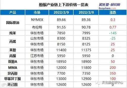 节后仅两个交易日,酚酮产业链整体呈现原料端产品涨势猛烈,偏下游产品积极跟涨的态势。春节归来,尽管下游复工待兴,但受春节期间油价强劲提振,酚酮产业链上游产品价格上涨,下游顺势成本传导。