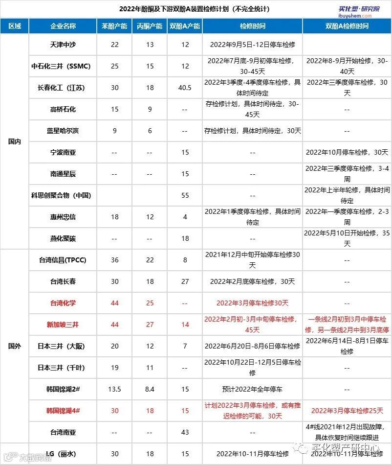 2022年国内酚酮装置检修多集中在下半年。从国外装置检修情况来看,2022年上半年酚酮装置检修较为集中。尤其一季度,中国台湾装置表现尤为突出,不管是台湾长春、台湾化学均有大修的预期,届时对外供应均有减少。韩国锦湖装置2号、4号线均有检修计划,且2号线有长时间停车的可能。因此,预估韩国、中国台湾货源供应量收紧,对中国的出口量也会相应的下降。