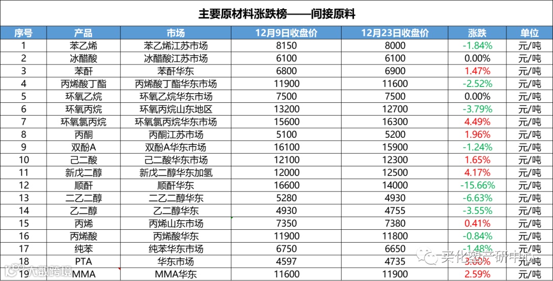 跌幅最大的是顺酐,下跌排名前五的分别为顺酐 -15.66%;动力煤 -13.49%;DB华东国产(桶装)-12.82%;异构二甲苯-6.78%;PMA-6.76%。